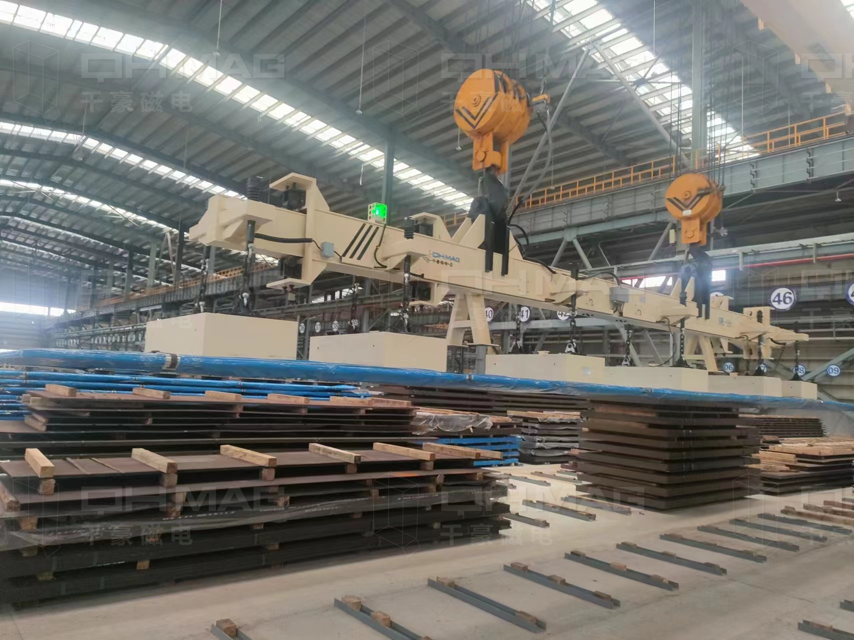 本次案例來源于:湖南千豪磁電為廣西某有限公司設計的【伸縮梁電永磁吊具】,由于該公司鋼板堆放空間有限鋼板長度尺寸差距較大,原有設備跺板機在吊運中經(jīng)常劃傷包裝,設備因汽車尺寸限制而產(chǎn)生干涉,嚴重影響鋼板出庫的質(zhì)量和效率,因此千豪磁電依據(jù)該公司鋼板尺寸設計了這款伸縮橫梁電永磁吊具。