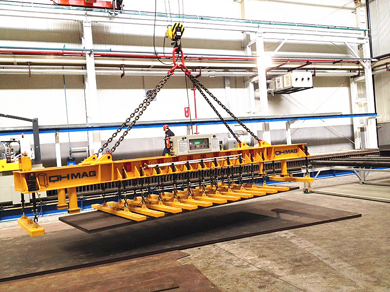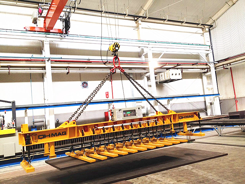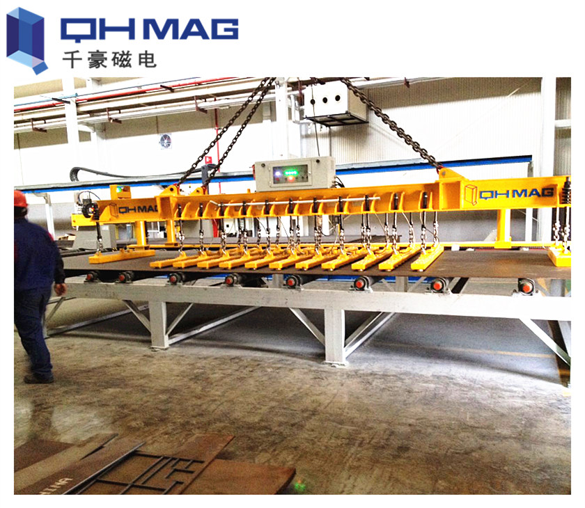 湖南千豪鋼板上下料切割線用電永磁吊具屬于鋼板吊具的一種:鋼板切割線(火焰切割、等離子切割、激光切割等)的上下料,通常要求上料時只吊運一張整板,切割完后,所有切割工件一次性或盡量多的從切割臺上吊運下來,針對這一要求,千豪磁電研發了矩陣式和密布式電永磁吊具系統。