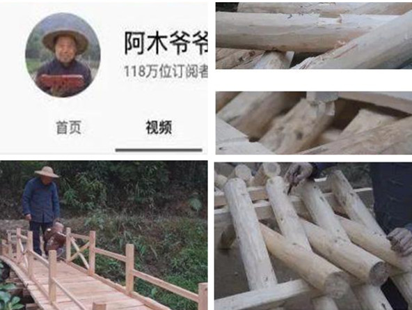 徒手做拱橋的視頻,不用釘不用角鐵,全靠一門中國自古就有的榫卯結構(在兩個構件上采用凹凸部位相結合的一種連接方式。)技術拼接而成。在油管上破了4000萬的播放量。